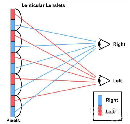 柱狀透鏡(LenticularLens)技術(shù)也被稱為雙凸透鏡或微柱透鏡3D技術(shù),其最大的優(yōu)勢(shì)便是其亮度不會(huì)受到影響。柱狀透鏡3D技術(shù)的原理是在液晶顯示屏的前面加上一層柱狀透鏡,使液晶屏的像平面位于透鏡的焦平面上,這樣在每個(gè)柱透鏡下面的圖像的像素被分成幾個(gè)子像素,這樣透鏡就能以不同的方向投影每個(gè)子像素。于是雙眼從不同的角度觀看顯示屏,就看到不同的子像素。不過像素間的間隙也會(huì)被放大,因此不能簡(jiǎn)單地疊加子像素。讓柱透鏡與像素列不是平行的,而是成一定的角度。這樣就可以使每一組子像素重復(fù)投射視區(qū),而不是只投射一組視差圖像。