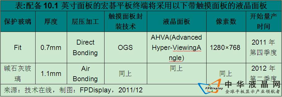 估計(jì)友達(dá)光電的月生產(chǎn)規(guī)模為1.5萬(wàn)~1.8萬(wàn)塊,成品率超過(guò)五成。厚度會(huì)比不采用OGS技術(shù)的產(chǎn)品減小3成。采用的玻璃為美國(guó)康寧稱(chēng)為“Fit”的化學(xué)強(qiáng)化玻璃,F(xiàn)it雖不如“Gorilla”玻璃堅(jiān)固,但十分易于加工。宏?目前正考慮采用基于更易加工的堿石灰玻璃的液晶面板(下表)。
