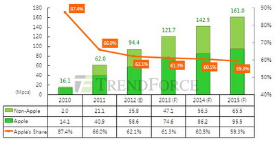 報告分析,蘋果的iPad會維持這樣的高市場占有率,其主因來自對手并未能追上iPad的腳步,雖然Android陣營推出眾多機種瓜分了部分平板市場,但仍未能憾動iPad的主導(dǎo)地位,在iPad 3挾其軟硬件的高度整合與新規(guī)格的高分辨率屏幕的優(yōu)勢,勢必再度拉開與對手的差距,這也是iPad在2012年在銷售上仍能一支獨秀,唯一讓人擔(dān)心的是其新一代高分辨率面板良率偏低下,是否能有足夠的數(shù)量來滿足市場所需則是其最大的隱憂。