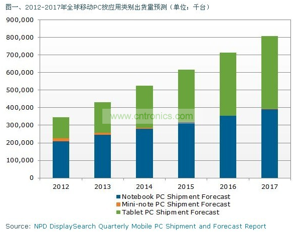 據(jù)DisplaySearch—平板電腦,如蘋果的ipad,預(yù)計(jì)將成為未來(lái)幾年移動(dòng)PC市場(chǎng)的主要增長(zhǎng)動(dòng)力。根據(jù)NPD DisplaySearch季度移動(dòng)PC出貨與預(yù)測(cè)報(bào)告Quarterly Mobile PC Shipment and Forecast Report,2016年平板電腦出貨量將超過(guò)筆記本電腦,移動(dòng)PC(指包括筆記本電腦、上網(wǎng)本、平板電腦等)總出貨量將從2012年的3億4千700萬(wàn)臺(tái)增長(zhǎng)到2017年8億900萬(wàn)臺(tái)。