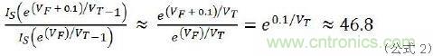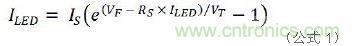 下面是圖1a行不通的原因所在。在公式1中,IS、RS是常數(shù),取決于LED產(chǎn)品本身,與VT是熱電壓無關(guān)。假設(shè)串聯(lián)電阻RS是理想值零,那么僅0.1V的VF變化就會產(chǎn)生47倍的ILED差異。