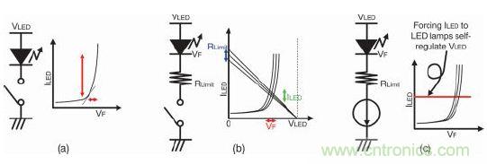 現(xiàn)在我們來看看圖1b。添加一個限流電阻器RLIMIT來保護(hù)LED燈。由于有限流電阻器,因此該燈不會被燒壞。在視頻顯示器應(yīng)用領(lǐng)域,這種方法在控制LED光強度方面仍然不夠好。LED曲線和RLIMIT產(chǎn)生的負(fù)載曲線可決定其LED電流值。如紅色或藍(lán)色標(biāo)記所示,該LED和電阻器分別存在制造誤差造成的正向電壓變化及電阻變化。這些誤差因素會使LED電流(綠)產(chǎn)生不可忽視的變化。