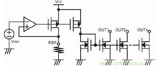 此外,我們都知道集成電路(IC)可提供良好的匹配電路對。這也是選擇恒流法的另一個優(yōu)勢。圖2是LED驅(qū)動器的基本輸出級結(jié)構(gòu)。市場上很多LED驅(qū)動器IC都有參考電流設(shè)置端 IREF,該參考電流是鏡像到其輸出端的恒流。