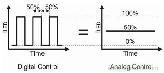 首先應(yīng)決定使用數(shù)字控制還是模擬控制。前面已經(jīng)介紹過,經(jīng)過 PN 結(jié)點的總電荷數(shù)可決定光強度,因此數(shù)字和模擬方法均可控制光強度。圖3是數(shù)字和模擬法中的50%灰階控制。在總體256個色階的示例中,該50%表明了一個有128個灰階的目標(biāo)。