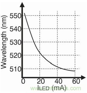 這時候,需要考慮電流變化對LED光輸出波長值的影響。改變波長就意味著改變?nèi)搜劭吹降纳省D4是綠色LED燈的實例。通常在業(yè)界,510nm 廣泛代表綠色。因此,大部分LED燈制造商所設(shè)計的LED燈產(chǎn)品在最大額定電流下都具備510nm的波長。在圖4中,隨著LED電流的升高,波長可達(dá)到510nm。獲得綠色的最佳方法是盡量使燈的驅(qū)動電流接近最大額定值。這也就說明了為什么使用數(shù)字控制比使用模擬控制好。