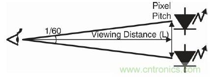 一套LED顯示系統(tǒng)包含大量的LED燈和一個大電源。設(shè)計系統(tǒng)時需要重點考慮LED燈的密度優(yōu)化問題。LED 燈的該密度稱為每個像素的距離或像素間距。如果像素間距太密,一旦超出了人眼能識別的精度,它就不會改善影像輸出質(zhì)量,而且會增加成本。人眼可識別的兩個單光源是在這兩點形成1個弧度的1/60(=1 弧分)時。