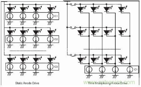 從圖2可以看出,LED燈的陰極采用當(dāng)前市場常見的LED驅(qū)動器IC驅(qū)動。這里要討論LED燈的陽極驅(qū)動器電路。陰極采用恒流驅(qū)動器有優(yōu)勢,陽極希望也只提供足夠的電壓。但仍需做出如何驅(qū)動陽極的重要決定!