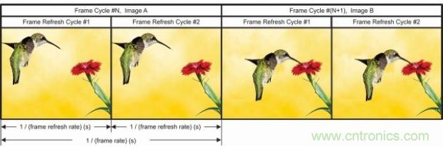 為滿足更快運行這一要求,很多LED顯示系統(tǒng)都在一個幀周期內(nèi)反復(fù)顯示相同的影像,稱為幀刷新率。圖10是幀速率與刷新率的關(guān)系。只有兩張幀影像:A 和 B。每個幀重復(fù)“影像 x”兩次。因而本實例“幀刷新率”= 2 ד幀速率”。