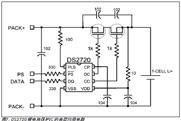 因?yàn)長(zhǎng)i+電池過(guò)充或過(guò)放可能會(huì)導(dǎo)致爆炸并造成人員傷害,所以使用這類(lèi)電池時(shí),安全是主要關(guān)心的問(wèn)題。因此,商用鋰離子電池組通常包括象DS2720這樣的保護(hù)電路(圖7)。