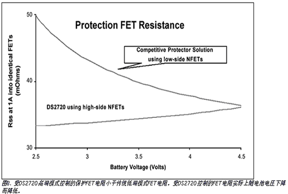 DS2720IC使用外部開(kāi)關(guān)元件,如低成本n溝道功率MOSFET,來(lái)控制充電和放電電流。內(nèi)部9V的電荷泵為外部n溝道MOSFET提供高端驅(qū)動(dòng),與常見(jiàn)使用相同F(xiàn)ET的低端保護(hù)電路相比具有更低的導(dǎo)通電阻。FET導(dǎo)通電阻實(shí)際上隨電池放電而減少(見(jiàn)圖8)。