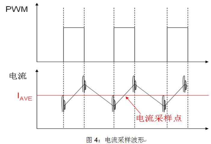 2) 能夠在PWM的開(kāi)通期間特定時(shí)刻觸發(fā)A/D采樣;因?yàn)樵赑WM逆變器帶感性負(fù)載的控制系統(tǒng)中,由于系統(tǒng)的一些寄生參數(shù)導(dǎo)致PWM在開(kāi)通和關(guān)斷期間電機(jī)的相線上出現(xiàn)振鈴(如圖4所示),這些振鈴會(huì)耦合到A/D采樣的回路中,因此我們應(yīng)避開(kāi)在PWM開(kāi)關(guān)過(guò)程中進(jìn)行A/D采樣。如果我們?cè)赑WM開(kāi)通期間的中點(diǎn)觸發(fā)電流采樣,我們將會(huì)得到電流的平均值,這將有利于我們對(duì)電流補(bǔ)償?shù)目刂啤?