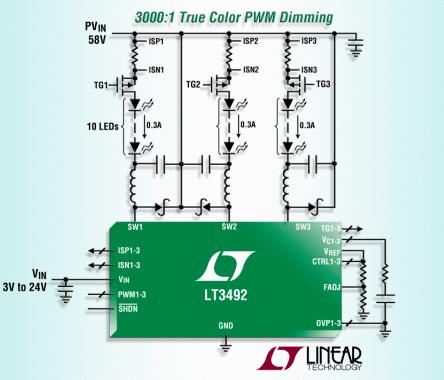 LT3492 在 LED 的高壓側(cè)檢測輸出電流,從而實現(xiàn)了降壓型、降壓-升壓型或升壓型配置。用戶用外部檢測電阻器可以設(shè)定每個通道的輸出電流范圍。3 個獨立驅(qū)動器通道的每一個都運用一個內(nèi)部 600mA、60V NPN 開關(guān),并具有內(nèi)置的柵極驅(qū)動器以用于 PMOS 斷接。其它特點包括 LED 開路保護和熱限制。