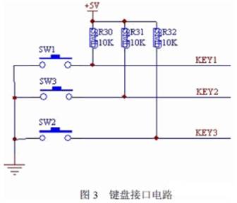 鍵盤接口電路如圖3 所示。鍵盤設(shè)計由三個按鍵控制即:“開關(guān)”鍵、“+”鍵、“-”鍵, 并外接三個上拉電阻控制鍵盤去抖。此三鍵分別連接到單片機的P1.0、P1.1、P1.2 接口進行控制。