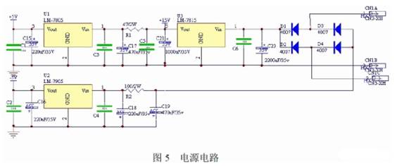 電源部分輸入220V、50Hz 交流電,輸出全機所需的三種電壓:+5V、+15V、-5V,主要供數(shù)控部分和D/A 轉(zhuǎn)換芯片使用;+15V 作為運放的正電源,同時也是穩(wěn)壓輸出電路的主電源。該電源模塊部分拓展了-5V 負電壓,同時作為運放的負電源,如圖5 所示。