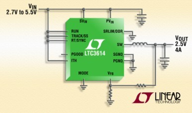 凌力爾特公司 (Linear Technology Corporation) 推出高效率同步降壓型穩(wěn)壓器 LTC3614,該器件采用恒定頻率、電流模式架構(gòu),能夠?qū)崿F(xiàn)高達(dá) 4MHz 的開關(guān)頻率。低電阻內(nèi)部開關(guān)允許采用 3mm x 5mm QFN 封裝的 LTC3614 提供高達(dá) 4A 的連續(xù)輸出電流,而且其低壓差工作允許輸出電壓范圍為 0.6V 至僅比 VIN 低數(shù) mV。LTC3614 在 2.25V 至 5.5V 的輸入電壓范圍內(nèi)工作,從而非常適用于單節(jié)鋰離子電池應(yīng)用以及 3.3V 或 5V 中間總線系統(tǒng)。其開關(guān)頻率從 300kHz 至 4MHz 是用戶可編程的,因而允許使用纖巧、低成本電容器和電感器。