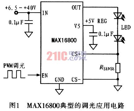 圖1為MAXl6800典型的調(diào)光應(yīng)用電路。MAXl6800具有高輸入電壓范圍(達(dá)40V),可直接連接到汽車電池而不需要保護(hù)器件,保護(hù)器件一般用來抵御電池負(fù)載變化帶來的浪涌電壓。MAxl6800能夠?yàn)長ED提供恒定電流,電流值可以通過與LED串聯(lián)的檢流電阻RSENSE設(shè)置。為了提高電流設(shè)置精度,提高對外部噪聲的抑制能力,MAXl6800采用差分電流檢測輸入方式。