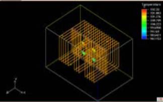 保持ICEPAK 對求解參數的默認設置,求解過程約需40 分鐘。從圖1 可以看出:功率管表面的最高溫度為102°C(模型中有六個openings ,迭代次數為140),與理論計算值相符。改變模型中的相關參數,我們對散熱器進行了優(yōu)化設計,結果表明:散熱器底板厚度為6mm比較適合, 另外, 不宜為了增加肋片數目而過度減小肋片間距, 最終取8.6mm 。