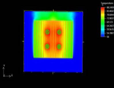 盡管散熱器的參數優(yōu)化對溫升控制略有改善,但仍不能滿足功率管的可靠性要求,因此,我們考慮強迫風冷的散熱方式。在上述計算模型的基礎上,我們在垂直方向設定流體的流速為1.5m/s , 即在散熱器底部送風,其他參數不變。我們注意到,此時系統(tǒng)給出的流態(tài)為紊流。在初始條件中作相應的調整后,最終求得的器件表面最高溫度約為89°C。散熱器底板截面溫度圖及橫向風速云圖分別見圖2、3。
