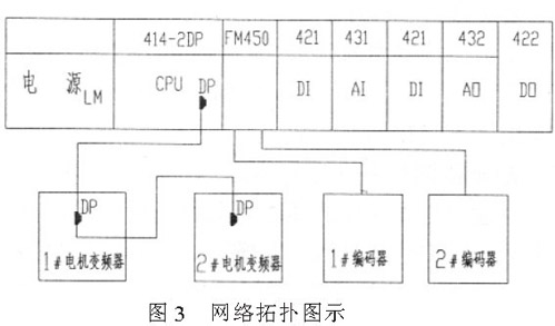 采用PLC 與變頻器控制方法, 實現(xiàn)多個分散驅動電機同步運行。PLC 采用西門子S7400 系列, 圖3為網絡拓撲圖。
