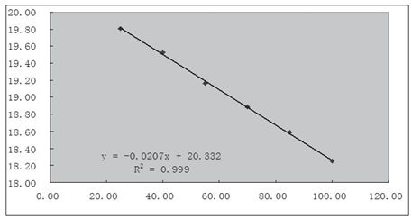 因測(cè)試時(shí)間較短,可以將測(cè)量時(shí)恒溫箱設(shè)置溫度近似等于LED光源的結(jié)溫。在600mA恒流的情況下,通過(guò)數(shù)學(xué)方法不難得出光源模塊正向電壓與結(jié)溫的關(guān)系。利用Excel工具,以溫度為X軸,平均值為Y軸,生成(X,Y)散點(diǎn)圖,選擇線(xiàn)性回歸分析類(lèi)型則可生成如下趨勢(shì)圖和公式。