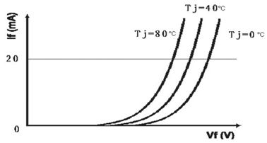 LED的伏安特性和其它二極管一樣具有負(fù)溫度系數(shù)的特點(diǎn),即在結(jié)溫升高時(shí)I/V曲線(xiàn)出現(xiàn)左移現(xiàn)象,如下圖所示。