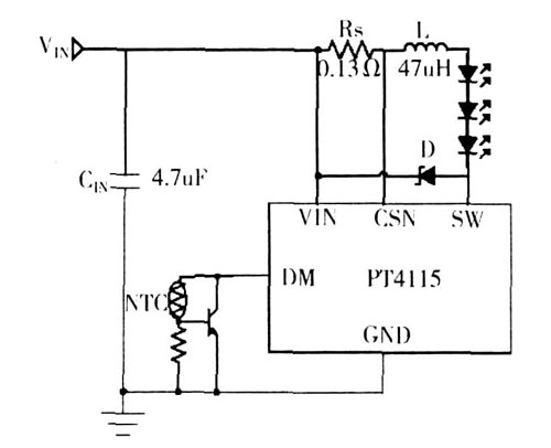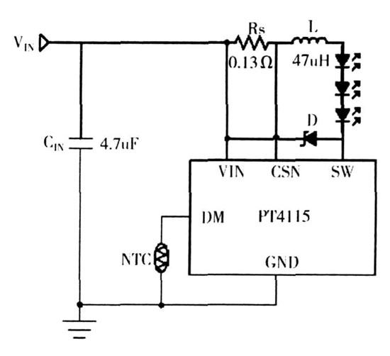 4) PT4115 內(nèi)部自帶過溫保護(hù)功能,外部過溫保護(hù)可設(shè),對(duì)LED 實(shí)現(xiàn)雙重保護(hù);