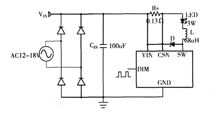 對(duì)于PT4115 (見圖4) 即可以應(yīng)用于12~18 V 的交流,也可應(yīng)用在8 V~30 V 的直流。因此,應(yīng)用范圍更加廣泛。并且,驅(qū)動(dòng)電路簡(jiǎn)單,所需元器件均價(jià)格低廉。適合批量、市場(chǎng)化。