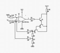 電壓-電流轉(zhuǎn)換模塊由精密運(yùn)放與三個(gè)晶體管組成的達(dá)林頓管電路構(gòu)成。轉(zhuǎn)換電路利用晶體管平坦的輸出特性和深度負(fù)反饋電路使輸出電流穩(wěn)定,如圖2所示,此V/I轉(zhuǎn)換電路的帶負(fù)載能力強(qiáng),電流輸出范圍達(dá)0~3A。輸出電流Io經(jīng)反饋電阻Rf得到一個(gè)反饋電壓Vf,Vf= V11-V12,通過R5、R6加到運(yùn)算放大器的兩輸入端,設(shè)運(yùn)放兩端的電為V1、V2,Vi由單片機(jī)DAC輸出。因?yàn)槔硐脒\(yùn)放的輸入電流約等于零,且 V1=V2,則: