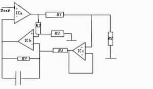 電壓-電流轉(zhuǎn)換模塊還有另外一種方案,即采用三個(gè)運(yùn)放構(gòu)成輸出電流可變的電流源,如圖3所示。輸出電流I=Vi/R1,為使R1兩端的電壓保持恒定,由差分放大器IC1b通過射隨器IC1c監(jiān)測(cè)R1兩端的電位,此電位經(jīng)IC1b的7腳加到比較器 ICa的反相輸入端與Vref比較,根據(jù)比較結(jié)果使比較器的輸出端變化,直到平衡為止,即Vr1=Vi。電路中的電容用于補(bǔ)償ICa的頻率,減少控制環(huán)路的延時(shí)。只要R1=R2=R3=R4=R5,此電路的性能較好,但帶負(fù)載能力不強(qiáng),環(huán)路延時(shí)補(bǔ)償對(duì)電路的穩(wěn)定有較大影響。