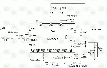 為滿足低耗電可攜式產(chǎn)品對于更精確、更安全的充電器應(yīng)用需求,許多IC制造商發(fā)展出低成本線性充電器。圖2是以通嘉科技的LD6275充電IC為設(shè)計(jì)范例,構(gòu)成僅需少數(shù)外部零件的獨(dú)立式線性充電器電路,其具備1.5A的最大充電電流。