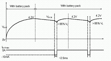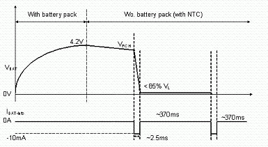 使用者亦有可能在充電或式充電完畢后,在未將電源移除的情況下,即抽離電池的情況。為避免造成危險(xiǎn),IC內(nèi)部應(yīng)具有如圖7, 8的電池存在偵測機(jī)制。充電IC會以短時(shí)間脈沖(每370ms產(chǎn)生2ms的脈沖)方式抽取電池電流,此時(shí)若電池存在,則偵測到的電池電壓應(yīng)大于一預(yù)設(shè)閥值;若電池已切離,則充電IC偵測到一低電壓,即可判定為電池?cái)嚅_狀態(tài),并將電池端電壓切斷,保護(hù)使用者安全。