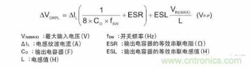 輸出紋波電壓是通過上圖的電感電流IL紋波ΔIL和輸出電容器的容值、ESR、ESL所產生的電壓合成波形,用下面公式表示。