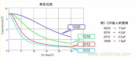 關于DC偏置,當然須選擇影響少的,不過即使電容值、耐壓相同,變動特性也會因封裝尺寸而異。下方圖表為其一例,顯示尺寸大者變動少??傊垊毡貜碾娙萜鲝S商取得充分的信息。