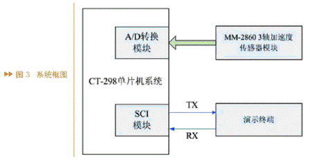 系統(tǒng)由三個部分組成:CT-298單片機控制部分、 MM-2860加速度傳感器部分、演示終端,系統(tǒng)框圖如圖3所示。