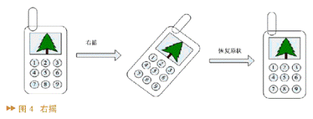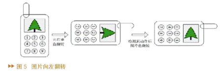系統(tǒng)設(shè)計了六種動作,他們分別是左搖、右搖、下?lián)u、上搖、圖片左轉(zhuǎn)、圖片右轉(zhuǎn)。圖4中的圖形象地說明了其中的兩個動作,其它的動作與此類似。