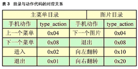 仿真器的外觀和操作類似一部移動電話,但是并不代表某個特定的設(shè)備,而是提供對其所支持的API 的正確實現(xiàn),每個命令按鈕對應(yīng)著相應(yīng)的API函數(shù)。從圖6中可以看到手機的導(dǎo)航鍵,我們更改了導(dǎo)航鍵的API函數(shù),使其從鼠標(biāo)單擊觸發(fā)的方式轉(zhuǎn)換為串口動作代碼控制。首先,我們編寫了J2ME的串口接收程序,用于接收從單片機傳來的單字節(jié)的type_action值;然后將type_action以參數(shù)的形式傳給API,手機根據(jù)不同的type_action值執(zhí)行不同的動作,包括菜單上下翻、進出二級子菜單、圖片翻轉(zhuǎn)等。手機動作與type_action的對應(yīng)關(guān)系如表3。
