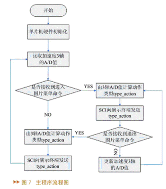 系統(tǒng)上電后,首先要對單片機的硬件系統(tǒng)進行初始化、配置寄存器等操作,之后才可以進行數(shù)據(jù)采集,將加速度的值進行A/D轉(zhuǎn)換,得到量化的值。圖片菜單是二級菜單,如果沒有接到演示系統(tǒng)傳給單片機進入二級菜單的指令,則單片機一直在主程序運行,不斷地采集A/D值、進行動作判定,并向演示系統(tǒng)發(fā)送type_action的指令。演示系統(tǒng)可根據(jù)接收到的type_action的類型采取相應(yīng)的動作。如果單片機接收到進入二級菜單的命令,則進入圖片菜單,同時也執(zhí)行類似于主程序的動作判定程序,并不斷更新A/D采樣值,發(fā)送type_action,直到接收到退出二級菜單指令才退出。下面詳細介紹一下各個功能模塊的具體設(shè)置。