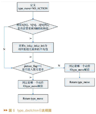 動作檢測主要是用獲得的三組數(shù)據(jù)值x_data[N]、y_data[N]、z_data[N]來判定當(dāng)前動作是系統(tǒng)設(shè)定動作中的哪一個,如果符合,則發(fā)送這個動作對應(yīng)的預(yù)定義值給演示終端,否則發(fā)送NO_ACTION。type_dectction()用來實現(xiàn)動作檢測,其中type_move為函數(shù)內(nèi)部變量,用于記錄動作代碼。type_dectction()進行動作檢測的流程如圖8所示。