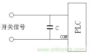 有時PLC或其它控制器的開關量輸入由于受外界干擾影響而瞬間輸入錯誤,導致PLC產(chǎn)生誤動作,這時在PLC的輸入端并上一個0.1uF的小電容就可以消除這種干擾,如下圖所示: