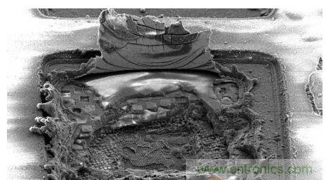 加州理工大學的工程師使用激光對芯片進行打擊。芯片可以在晶體管遭受完全破壞后恢復過來。下面這個圖片由掃描電子顯微鏡拍攝。
