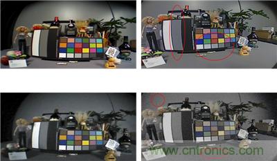 ASX34xAT系列在白天(典型情況為100-200lux明亮的光)和夜晚(典型情況為汽車倒車攝像頭在夜晚約10lux使用剎車燈和倒車燈)都較同類競(jìng)爭器件提供更好的色彩飽和度和對(duì)比度,如圖2紅圈所示,在白天180lux的光照條件下,競(jìng)爭器件采集到的圖像過度銳化,且色彩邊界有灰斑;在夜晚微光9.5lux的光照條件下,競(jìng)爭器件采集到的圖像過度銳化,且有更多的噪聲。