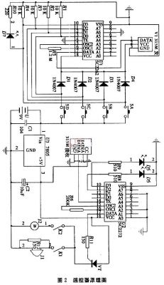 手持遙控器原理如圖2所示。電路由發(fā)射和接收?qǐng)?bào)警電路組成,發(fā)射電路由發(fā)射模塊V1、編碼芯片U1組成。U1即SC2262的1-8腳為三態(tài)地址編碼,這里我們將SC2262的7腳接地,同樣車(chē)載報(bào)警裝置的接收電路的解碼芯片SC2262也設(shè)置成7腳接地,否則不能解碼;接收電路由接收模塊V2和解碼芯片U2即SC2272組成,這里我們將SC2272的1-8腳三態(tài)地址編碼設(shè)置為1、2、7腳接地。對(duì)應(yīng)的車(chē)載報(bào)警裝置的發(fā)射電路也將三態(tài)地址編碼設(shè)為l、2、7腳接地。報(bào)警電路由震動(dòng)器J2,蜂嗚器兒和D5、D6兩個(gè)不同顏色的LED組成。電源分別有9 V和5 V。將9 V直接供給發(fā)射電路,再將9 V經(jīng)7805降到5 V供給接收電路和報(bào)警電路。